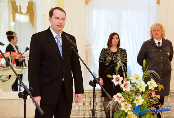 ![]() 15 марта 2017 года, года 100-летия органов загса, в рамках акции «Мы – граждане Беларуси!» в отделе ЗАГС г.Барановичи прошла торжественная церемония вручения первых паспортов граждан Республики Беларусь 14-летним барановичанам. Лучшие школьники города, которые проявили себя в учебе, спорте, конкурсах, получили свой основной в жизни документ - паспорт из рук депутата Парламента Татьяны Якубович и заместителя председателя горисполкома Алексея Гарбуза. Подарками для ребят стали экземпляры Конституции Республики Беларусь и книги «Я – гражданин Республики Беларусь». Торжественность момента была подчеркнута исполнением Государственного гимна Республики Беларусь. Сами виновники торжества с волнением говорили, что для них получить паспорта в такой торжественный день – большой праздник. Юные граждане Белоруссии пообещали быть достойными членами общества и добрыми делами прославить свою страну. Стены отдела ЗАГС были выбраны не случайно: именно здесь 14 лет назад родители ребят получили их самый первый документ – свидетельство о рождении. В церемонии приняли участие также начальник отдела ЗАГС Светлана Волынец, и. о. первого секретаря горкома БРСМ Андрей Ремез, начальник отделения по гражданству и миграции ГОВД Инесса Гетман и зав. сектором по работе с молодежью горисполкома Эмма Захарова. Учащиеся школы № 7 г. Барановичи подготовили для всех присутствующих гостей музыкальный подарок. ![]() В этом же красивом зале в центре внимания оказался и Андрей Ремез. Молодежному лидеру вручили удостоверение многодетной семьи, поздравили Андрея и его близких с этим прекрасным событием Алексей Гарбуз и Елена Герман, возглавляющая городскую организацию Белорусского союза женщин.