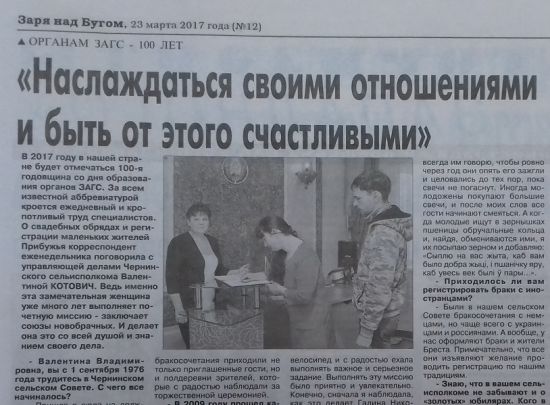 Хочется  отдать дань уважения профессионализму и чуткости наших коллег, которые уже много лет работают в сельисполкомах Брестского  района, нашим ветеранам. В связи с этим, 23 марта 2017 года,  в районной газете «Заря над Бугом» открыта рубрика «Органам ЗАГС -100 лет». И первый  работник, о котором мы рассказали - Котович Валентина Владимировна. Эта замечательная женщина с 1982 года выполняет свою почетную миссию  в Чернинском сельисполкоме Брестского района. За время работы она зарегистрировала более 800 бракосочетаний, 1375 рождений. С целью возрождения белорусских народных традиций,  торжественные регистрации  рождений, браков, юбилейных торжеств она проводит на белорусском языке со всеми  старинными обрядами.