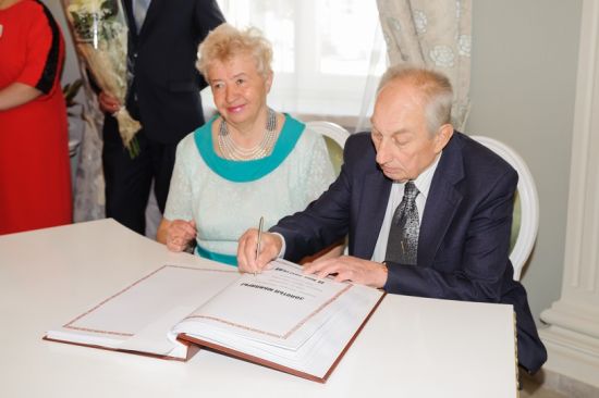 Прошла совместная волнительная церемония с взаимными поздравлениями и пожеланиями, подписанием записи акта о заключении брака молодоженами, проставлением подписей в книге Почетных гостей отдела загса юбилярами, вручением свидетельств о заключении брака и почетного свидетельства золотых юбиляров, сувениров с юбилейной символикой  и, конечно, свадебным вальсом для двух пар одновременно.